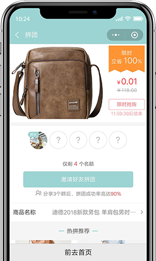 微拼團(tuán)是商品營(yíng)銷和售賣的一種方式,通過社交關(guān)系鏈分享傳播,可自由設(shè)置開團(tuán)人數(shù),開團(tuán)價(jià)格。用戶在分享時(shí),小程序上實(shí)時(shí)顯示當(dāng)前的拼團(tuán)信息,比如已經(jīng)有多少人參與,價(jià)格是多少等。
